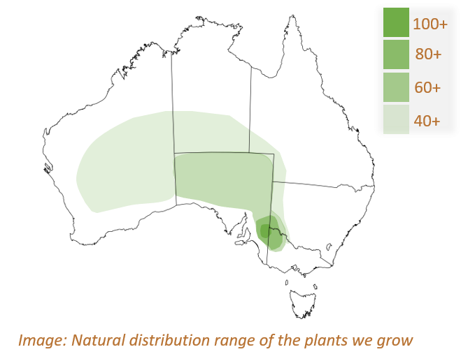 Riverland native plants was established in 2018 on our 6 acre farm 10km from the townships of Berri and Loxton. Since 2015 we have been rehabilitating our family farm by selecting plants adapted to surviving in arid and semi arid regions under low rainfall conditions as shown in the map below.